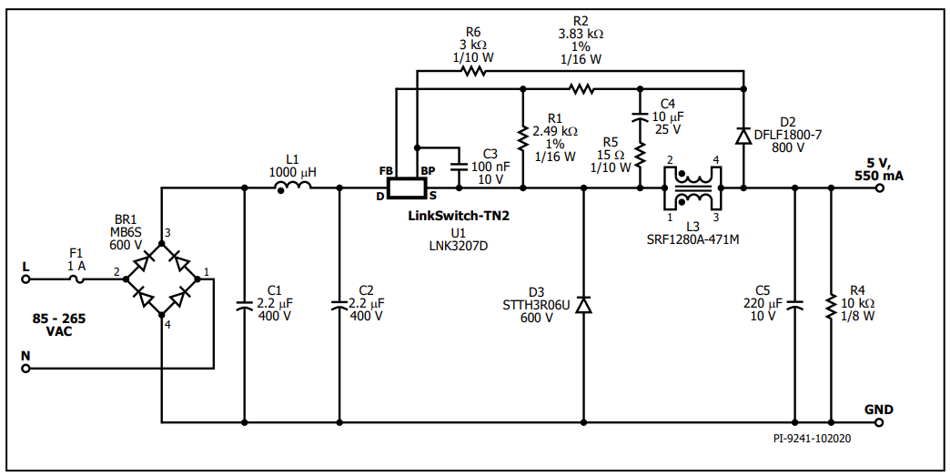 He encontrado una nota de aplicación donde se usa el LNK3207D para suministrar 5V@550mA, para este caso se adaptar bastante bien.