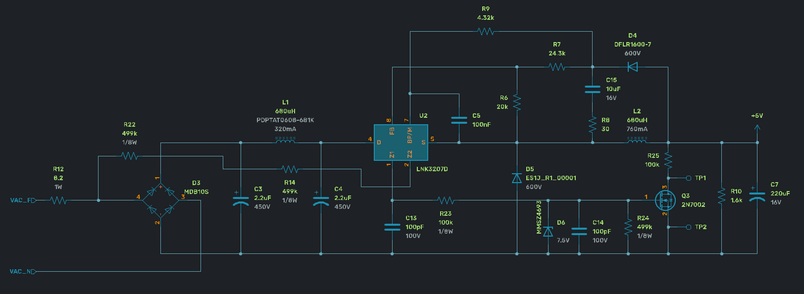 Anteriormente estuve investigando una fuente de poder pequeña que pudiera entregar potencia suficiente para alimentar un ESP32 y un relé, terminé usando la fuente LNK3207D la cual me puede entregar 500 mA de forma continua a 5 V, suficiente para alimentar un ESP32 y un relé.