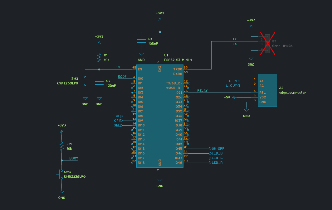 El cliente ha decidido trabajar con ESP32 S3, uno de las grandes ligas, no le pregunté el motivo solo lo pidió así. bueno la electrónica detrás de esto es simple, el típico botón de boot y reset, las conexiones de programación y los GPIOs de control. uno para el relé y otros para algunos LED y botones externos.