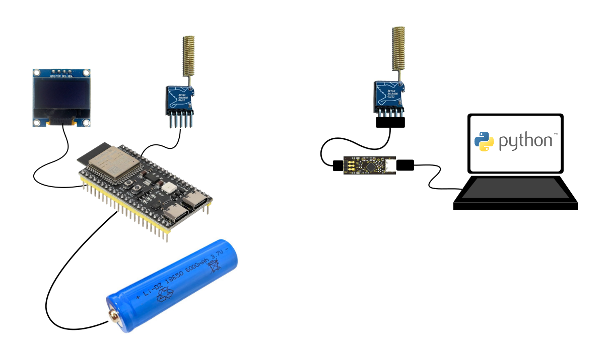 Hice un script en python el cual envía los mensajes a través del puerto serial al transmisor y otro dispositivo portátil que recibe los mensajes. le coloque una pantalla para poder ver la intensidad de la señal en función de la distancia.