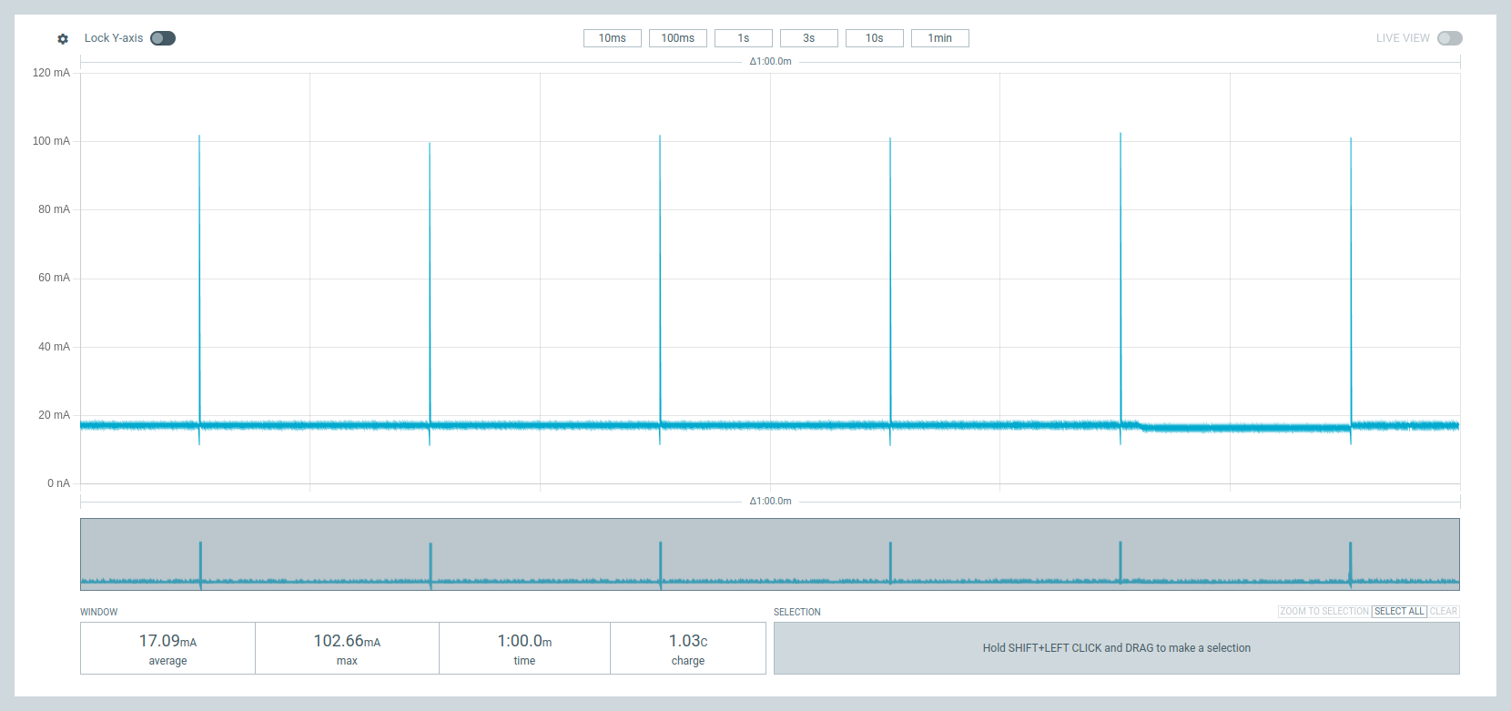 En este modo se tiene un consumo promedio de 17.09 mA, se puede ver que en cada envió el consume aumenta a 100 mA mientras envía el dato.